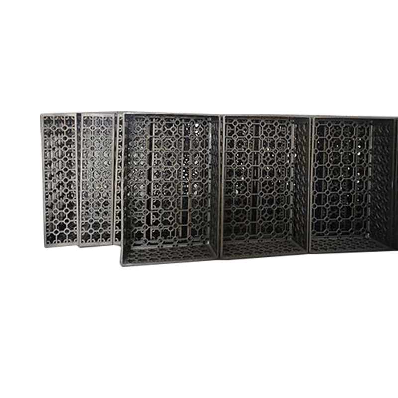 Der Wärmebehandlungsrahmen aus 1.4848 (GX40CrNiSi25-20) ist auf Platzausnutzung ausgelegt und kann kleine Werkstückchargen effizient laden und klassifizieren. Die Struktur ist sorgfältig entworfen, um die Stabilität des Werkstücks zu gewährleisten und Schäden oder Verschiebungen unter Hochtemperaturbedingungen wirksam zu vermeiden.